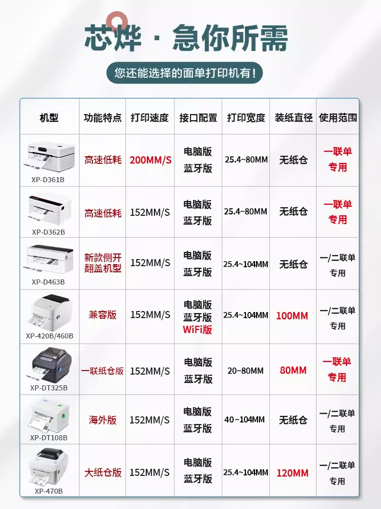 Brand: Xprinter/XinyeModel: XP-D362BColor classification: D362B computer model [dedicated for single order] 80mm paperless bin D362B Bluetooth model [dedicated for single order] 80mm paperless bin D10 computer model [dedicated for single order] side opening cover D361B computer model [dedicated for single order/label] 】200mm/s high-speed printing D361B Bluetooth model [one-link single/label] 200mm/s high-speed printing DT325B computer model [one-link single with paper bin] DT325B Bluetooth model [one-link single with paper bin] 460B computer model [one-two-link Single/Label] 460B Bluetooth model [One or two single/label] 420B Computer model [Sheet/label] 420B Bluetooth model [Shell/label] 420B Network port model [USB+Network port] 420B LAN WiFi model [One or two joints] Single/label] 420B cloud printing model [108mm bill/label] 470E computer model [300-point high-definition printing] 470E Bluetooth version [300-point high-definition printing] D463B computer model [one or two joints, single label] D463B Bluetooth version [one or two joints] List of labels] DT108B computer model [one or two sheets/label] + luxury four-piece DT108B Bluetooth model [one or two sheets/label] + luxury four-piece 470B computer version [one or two sheets/label] 470B Bluetooth version [ One or two couplets/label]