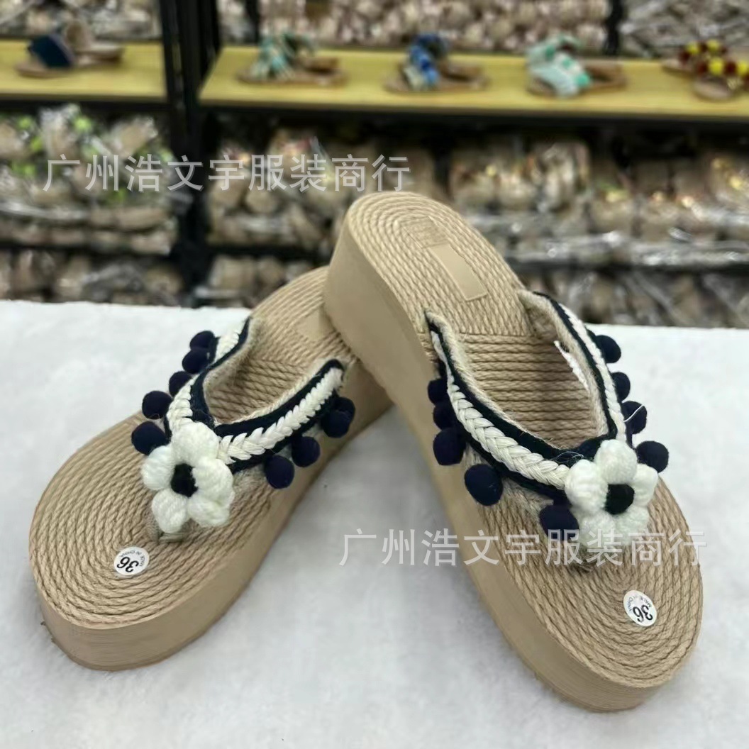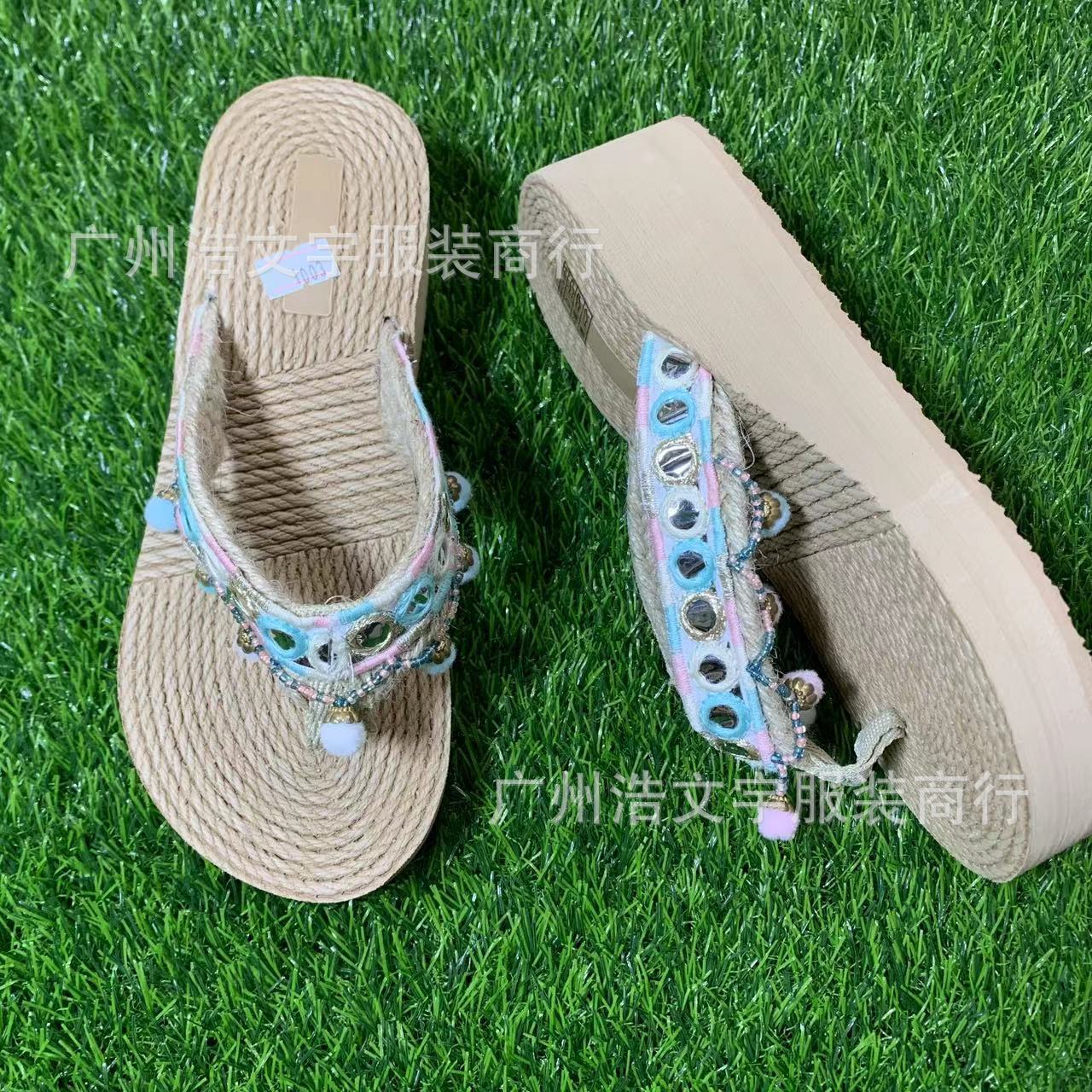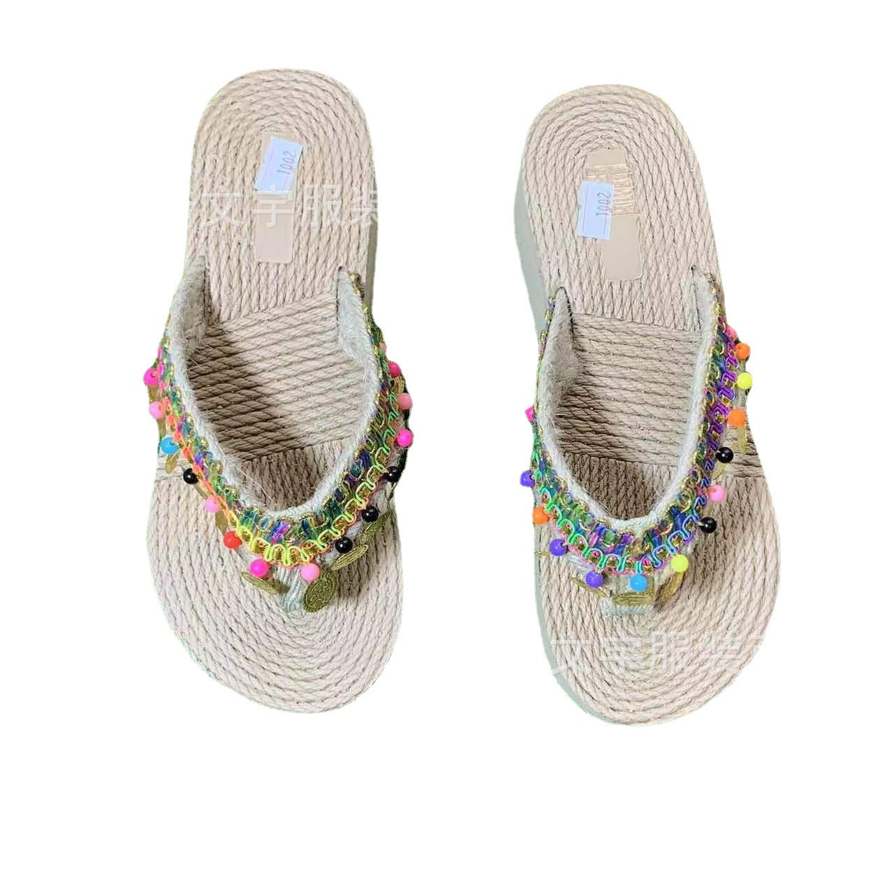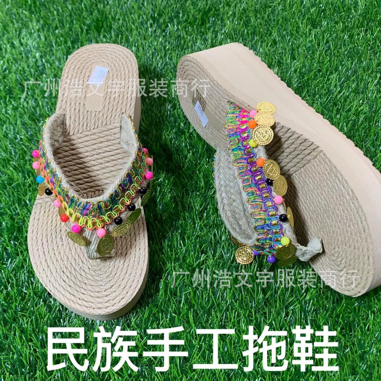 Xishuangbanna handmade flip-flops women’s summer outerwear net red fashion tassel national wind slope heel high-heeled beach shoes